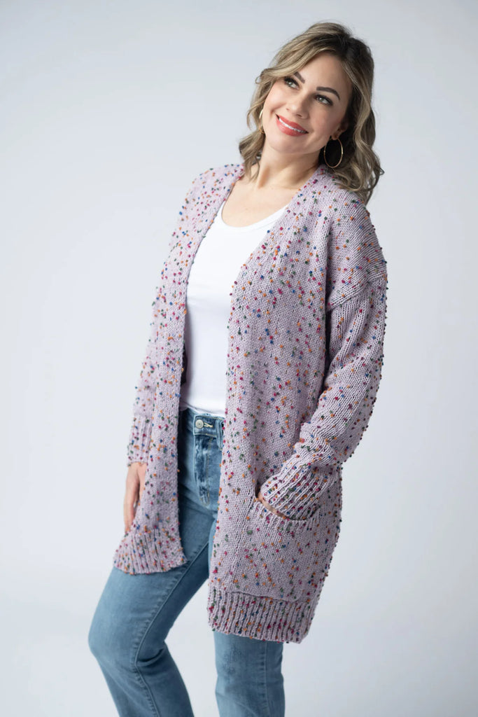 One of Stevie’s BEST SELLING cardigans year after year! Spring colors are here! This cardigan is everything!! Chunky sweater knit fabric that is cozy and soft! Features size pockets and multi-color "confetti" dots throughout.